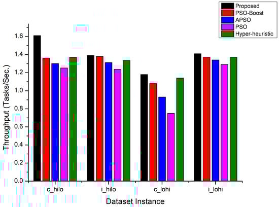 The results shown in Figure 5 show the throughput achieved for all the compared approaches. The empirical results (depicted in Figure 5) reveal that the proposed scheduling algorithm has improved the throughput by 6–22.32% against the compared approaches. Again the PSO-BOOST and Hyper-heuristic approaches attained second best throughput results and dominated the other compared approaches.