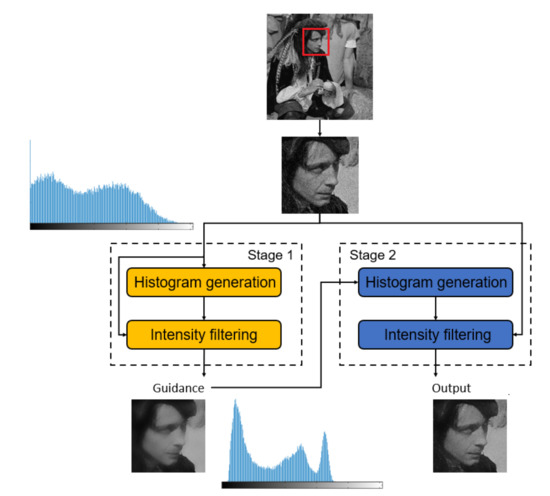 We propose a novel Dual-Histogram BF (DHBF) method to achieve better denoising and edge-preserving smoothing with time complexity regardless of the kernel radius. It contains two stages as shown in Figure 1. In Stage 1, we produce the noise-reduced guidance map using the proposed computationally inexpensive edge-preserving BF to remove noise but preserve image details. Next, Stage 2 outputs the final filtered image based on the proposed edge-preserving BF with the range kernel computed using the guidance image obtained from the output patch of Stage 1.