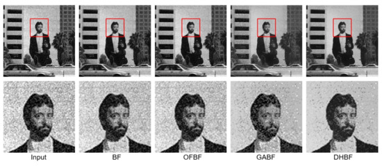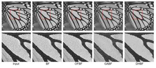 To show the visual perception effects of edge-preserving image smoothing from each BF-based method, we selected one representative sample from each of the above five databases. We observed that some obvious noise artifacts still remain in the image after the BF [10], OFBF [22], and GABF [25] are applied to it. In contrast, our DHBF method further enhanced the output quality of the BF method based on the proposed two-stage framework. Our proposed DHBF can focus on the photometric representation between pixels to refine the image details regarding BF behavior. For example, our DHBF method further preserved the edges with noise reduction at the man head, butterfly wings, girl face, building, and texture chart shown in Figure 7, Figure 8, Figure 9, Figure 10 and Figure 11, respectively.
