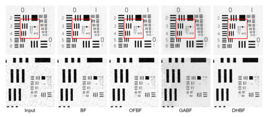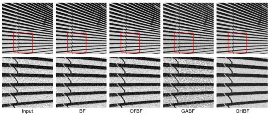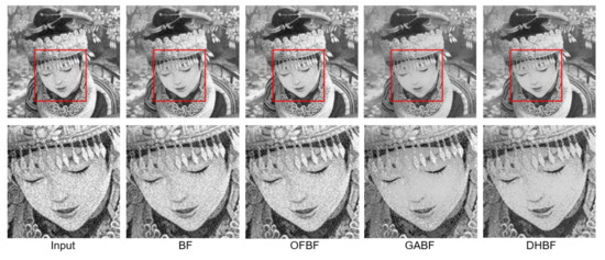 As shown in Figure 2, Figure 3, Figure 4, Figure 5 and Figure 6, we chose five benchmark datasets, BSDS100 [33], Set5 [34], Set14 [35], Urban100 [36], and USC-SIPI [37] containing test images with a wide variety of contents. These images are converted to their grayscale versions for testing. We compare the proposed DHBF with three preivous BF methods, including BF [10], OFBF [22], and GABF [25]. These methods were all implemented with Matlab R2018b and tested in a laptop with Intel i7 CPU at 2.8 GHz and 16 GB RAM. We set both and to 15 in all compared methods. For DHBF, we set in Stage 1 and in Stage 2. The other parameters were set as the compared methods. To simulate noisy images, we add a random Gaussian noise with the standard deviation of .
