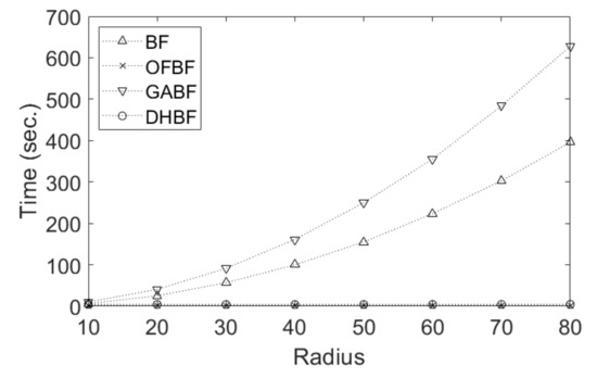 Table 1 lists the FR-IQA results obtained using all the compared methods. We can see that DHBF performs favorably against other BF methods. Figure 12 demonstrate a runtime comparison of the compared BF methods with various kernel radius, ranging from 10 to 80 for processing test images. As shown, both OFBF and DHBF methods run with constant time regardless of the radius sizes of the filter kernel. By contrast, BF and GABF require additional computation costs when a larger radius is used. According to all experiments mentioned above, DHBF performs the best for denoising while achieving time complexity.