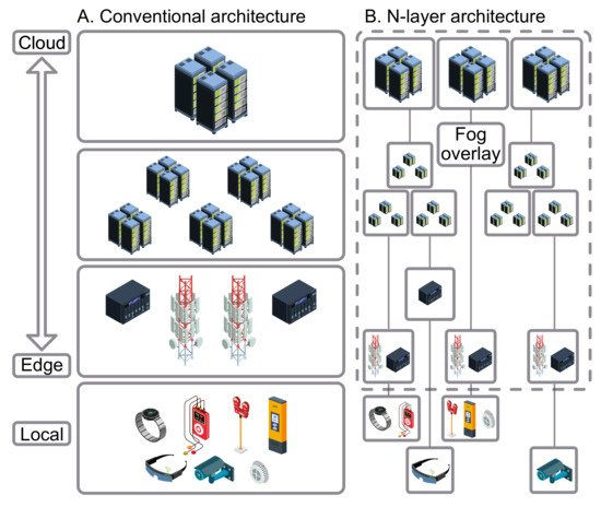 Communication, storage, control, decision-making, and computing close to the Edge of the network are specially chosen by Fog architecture. Here, the executions and data storage are executed to solve the shortcomings of the current infrastructure to access critical missions and use cases, e.g., the data density. OpenFog consortium defines Fog computing as “a horizontal, system-level architecture that distributes computing, storage, control, and networking functions closer to the users along a Cloud-to-thing continuum” [36]. Another definition explains Fog as “an alternative to Cloud computing that puts a substantial amount of storage, communication, control, configuration, measurement, and management at the Edge of a network, rather than establishing channels for the centralized Cloud storage and use, which extends the traditional Cloud computing paradigm to the network Edge” [37].