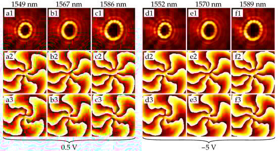 - Strain, M.J.; Cai, X.; Wang, J.; Zhu, J.; Phillips, D.B.; Chen, L.; Lopez-Garcia, M.; O’Brien, J.L.; Thompson, M.G.; Sorel, M.; et al. Fast electrical switching of orbital angular momentum modes using ultra-compact integrated vortex emitters. Nat. Commun. 2014, 5, 4856. [Google Scholar] [CrossRef]
