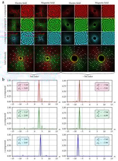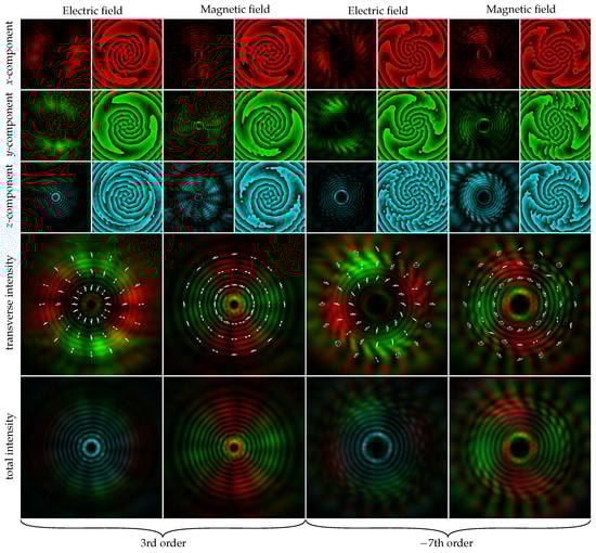 - Khonina, S.N. Vortex beams with high-order cylindrical polarization: Features of focal distributions. Appl. Phys. B 2019, 125, 100. [Google Scholar] [CrossRef]