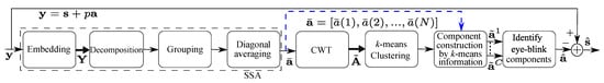The key components of the proposed method for eye-blink artifact removal is shown in Figure 1. It is a two-step approach: first, an eye-blink artifact is extracted from the contaminated single-channel EEG signal using SSA. Next, the extracted eye-blink artifact is denoised in the non-artifact region using CWT and means algorithms.