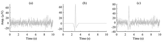 (a,b) Synthetically constructed ground truth EEG signal and the EOG artifact (), respectively, and (c) the contaminated EEG signal for the artifact mixing constant p = 0.5.