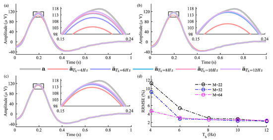 The estimated eye-blink artifacts (the artifact region only) by SSA with different thresholds and the window lengths (a) , (b) , and (c) . (d) Performance of SSA in terms of RRMSE for varying window length M and thresholds ( and 12 Hz). The RRMSEs were calculated with respect to the ground truth eye-blink signal, .