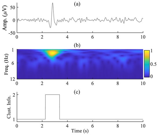 (a) The extracted eye-blink artifact () by SSA, (b) its time–frequency representation using CWT (normalized plot) and (c) clustering information.