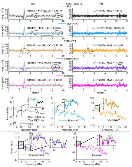 The time–frequency representation of the extracted eye-blink artifact , in Figure 4a obtained by SSA, is shown in Figure 4b. As the eye-blink component is a strong component in , also evident from Figure 4a, the feature vectors of the time–frequency matrix (Figure 4b) between and s are significantly different. It is clear from the clustering information, shown in Figure 4c that all of the feature vectors (the columns of time-frequency map) corresponding to the eye-blink artifact region belong to cluster 2. The features vectors that correspond to the non-artifact region belong to cluster 1. By computing (12), we have obtained two signals and , (as ). We have computed the FD of these two components to identify the eye-blink artifact. As the eye-blink artifact is a low-frequency component, we expect its corresponding FD to be a low value. Finally, the denoised eye-blink component is identified based on their FD value. The estimated eye-blink artifact and the corrected EEG signals using the proposed and the existing methods are shown in Figure 5. Even though the SSA and SSA+ANC methods extracted the eye-blink artifact very well, they also extracted the low-frequency EEG information from the non-artifact regions, as shown in Figure 5a. Although VME-DWT does not alter the non-artifact regions, it removed the eye-blink artifact partially (see circled region), whereas the k-means+SSA method removes valuable EEG information (see the circled region in the fourth row). In contrast, it is also clear from Figure 5b that there is no loss of EEG information with the proposed method. The RRMSE, the CC, the artifact reduction ratio () and MAE values shown in Figure 5 also reveal the superiority of the proposed method over the existing methods. We also computed the power spectrums of the true EEG, the contaminated EEG and the corrected EEG signals to observe any spectral changes in the EEG signal after the artifact removal. Figure 5c–g shows the superposition plots of the true EEG, contaminated EEG and the corrected EEG signals using all methods. It can be observed from the power spectrum plots of the true and corrected EEG signals that the proposed method almost preserves the low-frequency information of the EEG signal as compared with the existing methods.