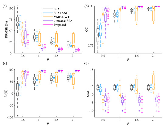 Performance of the existing and the proposed methods in terms of (a) RRMSE, (b) CC, (c) artifact removal ratio () and (d) MAE (in log scale) with respect to the artifact mixing constant p. (The artifact mixing constant p is of the signal.