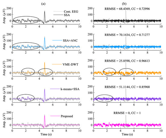 The estimated eye-blink artifact and the corrected EEG signals (Fatigue EEG data) with all the methods are shown in Figure 7a,b. From Figure 7a, we can see that the low-frequency components are still present in eye-blink artifacts obtained by the SSA and SSA+ANC methods (see the non-artifact region between 1–4 s). As a result, low-frequency EEG information is removed from the corrected EEG signal obtained by the SSA and SSA+ANC, as shown in Figure 7b, whereas the VME-DWT method partially removed the eye-blink artifact and altered the non-artifact region in the time interval 2–3 s. The k-means+SSA method also altered the non-artifact region of the EEG signals in time interval 1–4 s (as indicated by circles in Figure 7b). The corrected EEG signal obtained by the k-means+SSA method and the contaminated EEG signals do not match in the non-artifact region (see 1–4 s in Figure 7b time interval). However, the corrected EEG signal obtained by the proposed method perfectly matches with the non-artifact region of the contaminated EEG signal, as shown in Figure 7b. The RRMSE and CC values shows the superiority of the proposed method over the existing methods.