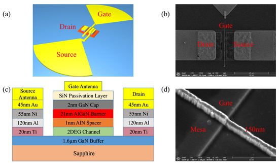 The device was prepared with the mesa isolation by inductively coupled plasma etching. Source and drain (6 m × 3 m) with a gap of 3 m were aligned, and then e-beam deposition was used to form the metalayers: Ti/Al/Ni/Au (20/120/55/45 nm). This was followed by a rapid thermal annealing at 400/700/870 C (170/40/30 s) to form the source and drain ohmic contact, which provides an unimpeded channel for plasma waves. A bowtie antenna with an optimal radius of 60 m and radial size of 90 degrees was fabricated by lithography. Finally, a nanogate (150 nm) placed in the center of the gap between source and drain was aligned by electron beam lithography, and then magnetron sputtering was used to form Ni/Au (20/200 nm) metalayers. A schematic of the HEMT is shown in Figure 1c, and the finished device is presented in Figure 1b,d. The two arms of the bowtie antenna were integrated with the gate and source of the HEMT to form an asymmetric structure.