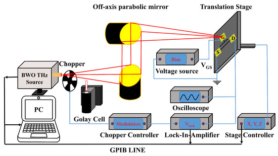 The experimental setup for the characterization of the detector is shown in Figure 2. Continuous-wave radiation was generated from a backward-wave oscillator (BWO) and focused onto the surface of the detector at the fundamental frequency (175–384 GHz) by two off-axis parabolic (OAP) mirrors (90 degree OAP, Effective Focalength (EFL) = 152.4 mm). The received total power at every electromagnetic frequency was calibrated using a THz Golay cell. The detector was mounted on an FR-4 printed circuit board (PCB) and could be precisely moved by a motorized translation stage. The gate electrode was connected to a DC bias. The source was grounded, and the rectified THz voltage of the detector () was measured using a lock-in amplifier (Stanford Research Systems, SR830). A chopper (SR540, 4–3700 Hz) was used to convert the continuous wave into a square wave, and the modulation signal was simultaneously fed into the lock-in amplifier. A mixed signal oscilloscope (Agilent MSO7104B) was used to record the temporal response before the lock-in amplifier. The data were collected on a personal computer from a General Purpose Interface Bus (GPIB) line. The DC electrical performance of the detector was measured by a semiconductor device analyzer (Agilent B1500A).