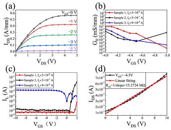 (a) I-V characteristics of sample 1. (b) Measured source–drain conductance () as a function of the in the subthreshold regime. (c) Different leakage currents of the three samples. (d) Output characteristics of sample 1 at V.