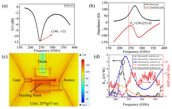 (a) The simulated S11 of the structure. (b) The simulated impedance of the structure. (c) Distribution of the electric field on the surface of the TeraFET detector around the gate (top view). (d) Measured and simulated with and without a bowtie antenna from 175 to 384 GHz. The red line indicates the measured NEP of the detector with a bowtie antenna. All the results above correspond to sample 1.