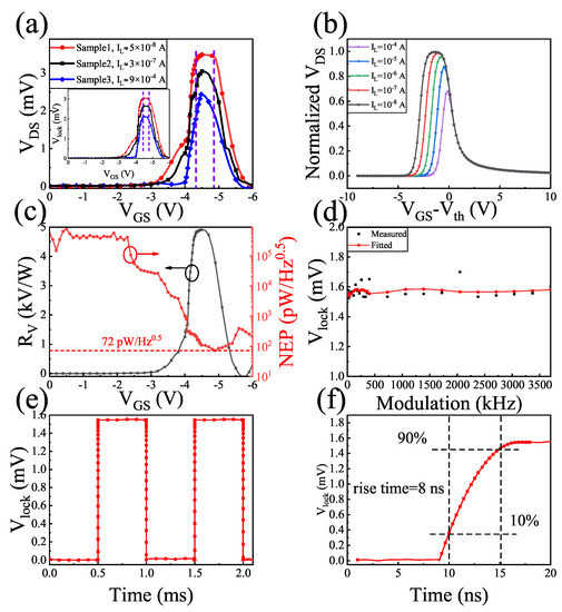 where is the active area of the THz detector, is the beam spot size, and is the total power of the THz source. The term represents the loading effect, which causes the drop after the gate voltage () to be less than the measured using the lock-in amplifier [15]. 10 M is the input impedance of the lock-in amplifier, and is the output voltage, which is directly read out from the amplifier. Since the detected signal is a square wave, a factor of must be included in the calculation. In the equation of NEP, is the thermal noise of the HEMT, k is the Boltzmann constant, T is the absolute temperature (room temperature = 300 K), and is the channel resistance of the HEMT.
