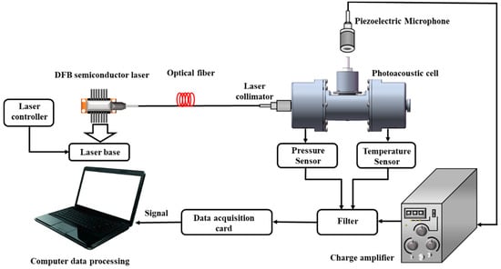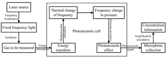 Unlike the traditional method of measurement, which mainly utilizes absorption spectroscopy, and the device usually measures the analyte’s power of absorbed light after the laser has passed through a certain path, measurement based on photoacoustic spectroscopy is different in terms of both theory and methodology. The schematic diagram is shown in Figure 2. The analyte first enters a closed photoacoustic cavity. Here, with a light source of radiation inducing it to absorb energy, the molecule of the analyte jumps from a low energy level to a high one. However, the high energy level of the analyte molecule eventually returns to a low energy level as its energy is distributed through its own release and non-radiation relaxation. Moreover, the molecular energy is converted into translational energy during the non-radiation relaxation process, which causes the temperature of the analyte to rise. In addition, the frequency of the temperature change of the analyte in the photoacoustic cell can be kept the same as the frequency of modulation by modulating the frequency of the incident light. The temperature change in the photoacoustic cell results in a pressure change in the photoacoustic cell, which causes the emergence of the acoustic signal. The acoustic sensor converts the acoustic signal into a photoacoustic signal. The concentration of the analyte can be accurately calculated using the known proportional relationship between the intensity of the photoacoustic signal and the concentration of the analyte.