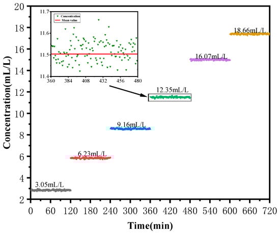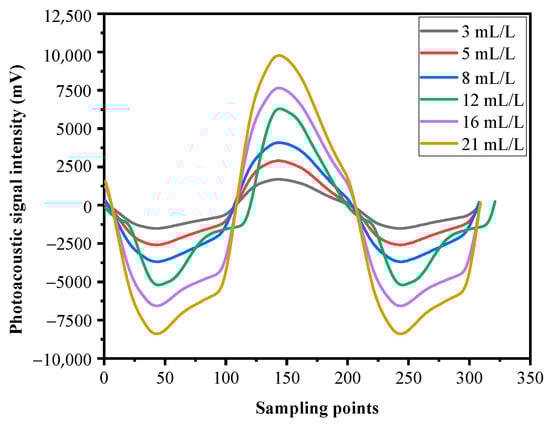 From Figure 8, the conclusion can be drawn that the intensity of the photoacoustic signal gradually increased as the concentration of CO2 in the solution increased, which is consistent with results described in []. The photoacoustic signal collected by the PZT piezoelectric ceramic microphone changed with the concentration of CO2; specifically, the intensity of the photoacoustic signal was found to be proportional to the concentration of CO2. Therefore, the measuring device proposed in this paper was able to directly measure the concentration of CO2 in gas-liquid solution.