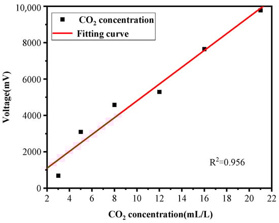 The first experiment mainly sought to analyze how the intensity of photoacoustic signal changes as the concentration of CO2 varies. The data acquisition card collected 100 sets of data, each of which included 10,240 sampling points. Each sampling point corresponded to the voltage values output by the charge amplifier. The peak voltage value of each set of data was selected and then the average value calculated, being the voltage for different concentrations of CO2. The results are shown in Figure 8. Figure 9 shows the calibration curves of different CO2 concentrations versus photoacoustic signal intensity.