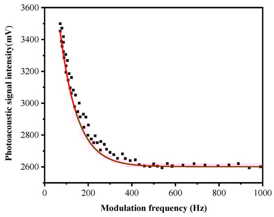 From Figure 10, it can be inferred that the intensity of the photoacoustic signal gradually decreased as the laser modulation frequency increased. When the laser modulation frequency was above 100 Hz, the intensity of the CO2 photoacoustic signal hardly changed. This does not conform to the inverse relationship between the intensity of the photo-acoustic signal and the modulation frequency of the laser described in Equation (6) in the text. The reason is that when the laser modulation frequency is above 400 Hz, the response of the PZT piezoelectric ceramic microphone to the intensity change of the photoacoustic signal of CO2 is not obvious. Since previous measurement devices include a degassing component, this generates a different experimental result []. This can be primarily explained by the fact that CO2 is in a different environment. Secondly, the photoacoustic cell used in [] operates in a resonance mode (1.7 kHz), while the device proposed in this paper operates in a non-resonant mode (20 Hz). Moreover, the results regarding the relationship between the modulation frequency of the laser and the photoacoustic signal intensity obtained from the experimental research on the measurement of gas concentration in pure liquid based on photoacoustic spectroscopy is similar to what has been recorded in the literature [].