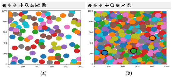 We evaluated the performance of the proposed algorithm by implementing it in Python language using the Shapely and MathPlot libraries. We generated different topologies with 100 up to 800 (stepping 100) nodes deployed randomly in the network area. We set the width and height of the network area to 1000 m and selected the x and y coordinates of nodes uniformly between 0 and 1000. If the selected random position was already assigned to another node, we selected a new random position for the current node. We set the sensing range of the sensor nodes between 20 and 100 m and counted the number of detected redundant covered nodes by the algorithm. Figure 7a–d, respectively, show sample generated networks with 100, 300, 500, and 700 nodes and the detected covered nodes in these networks. In this figure, the sensing range of all nodes is 40 m, the size of the area is 1000 m × 1000 m, and the nodes with thick borderlines are the detected covered nodes.