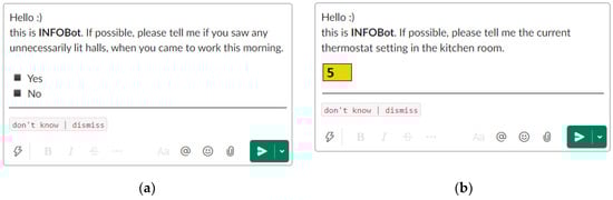 Possible rendering of sensing requests, as presented to a user: (a) a closed-ended question and (b) a question about a number; based on Slack [10].
