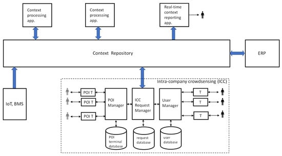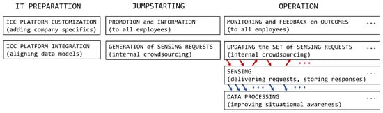 Mobile crowdsensing has been recently advocated in the context of industry, and, more specifically, Industry 4.0 [26,27,28]. Most employee-related use cases covered in those papers fall under opportunistic sensing, i.e., using physical sensors embedded in employees’ mobile devices (not the case in ICC). “Subjective” data provided by humans, “subjective assessments,” “human knowledge,” and “integrated human wisdom” are also mentioned in [26,27,28], with at least a part of this input meant to come from employees (the other part coming from customers). These ideas are close to ICC but are put forward in general terms. Moreover, ICC is not limited to industrial, or even business-oriented, organizational settings.
