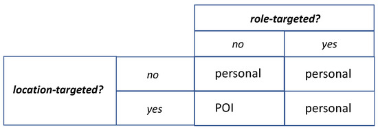 We also assume, somewhat arbitrarily, that requests that are neither location-targeted nor role-targeted are passed for personal delivery (Figure 3). If a personal delivery does not produce a response (maybe all recipients have dismissed the request), ReqMngr may try POI delivery. In that case, the fact that POI terminals have specific locations does not matter; they become a means to deliver a location-neutral request.
