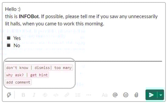 Possible rendering of a sensing request, with the full selection of generic buttons (enclosed); based on Slack [10].