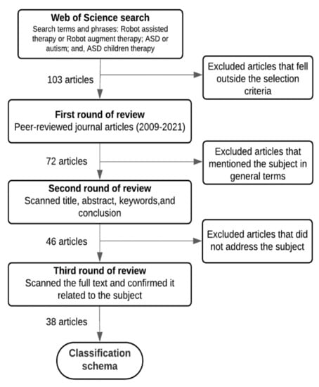 We searched Web of Science (WoS) [15] to obtain a comprehensive bibliography of the academic literature on RAAT. The WoS database provides the most trusted, major world-leading citations from databases such as Science Direct (Elsevier), IEEE/IEE Library, ACM Digital Library, Springer Link Online Libraries, and Taylor & Francis. Specifically, we searched the WoS Core Collection database for articles over a span of 10 years, 2009–2021, Using basic search settings, we input search terms and phrases, such as: Robot-assisted therapy or Robot augmented therapy; ASD or autism; and, ASD children therapy. According to WoS search result templates, auto-generated search terms are a result of searches covering articles, meeting abstracts, book chapter(s), and proceedings papers. The initial search resulted in 103 research papers. From these, we selected only peer-reviewed journal articles and excluded meeting abstracts, book chapters, conference proceedings, workshop descriptions, masters and doctoral dissertations, and non-English language articles. Figure 1 shows the search results along with the filtering process.