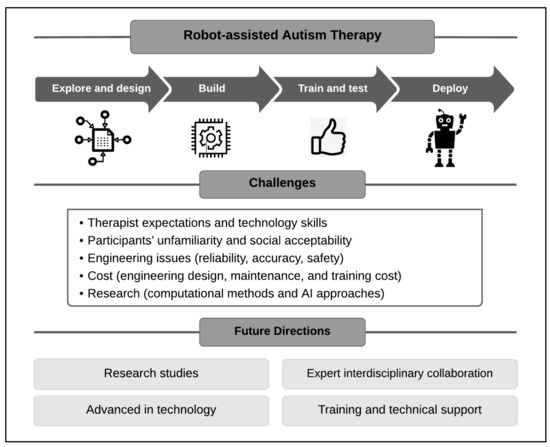 Using robots during therapy sessions has benefits because individuals with ASD require the types of physical interaction that can be provided by robots since they have challenges communicating with real people [9,10]. Moreover, many studies have implemented RAAT solutions to help children with ASD develop social communication, education, and many other skills for their social world. For example, a robot was designed to teach music fundamentals to children with high-functioning autism [11]. In addition, researchers noted that long-term LEGO therapy with a humanoid robot for children with ASD significantly increased social initiations and had positive effects on the children’s engagement [12].
