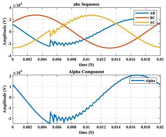 ABC sequence and alpha component of voltage waveform for a sample fault.