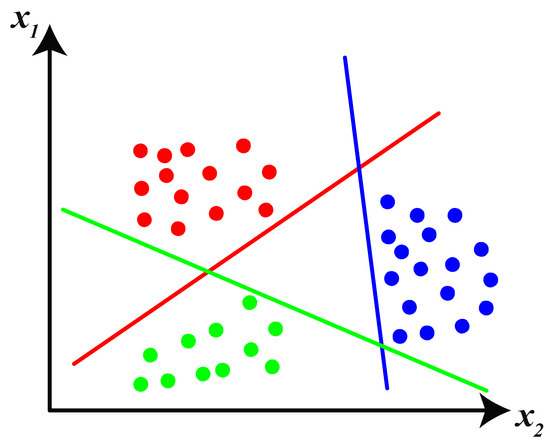 SVM is one of the most popular machine learning methods that uses supervised learning and models to classify or regress a discrete or continuous set of data, respectively. An SVM learning algorithm creates a model that allocates training examples to one or another specified category, which results in generating a non-probabilistic binary linear classifier. However, there are some methods, such as Platt scaling, that utilize SVM in a probabilistic manner. SVM projects training data vectors to locate in space in order to expand the distance between any categories as much as possible. The test data vectors are then projected into the same specified area and classified according to which part of the space they stand on [36]. Figure 3 shows the functionality of SVM in a two-dimensional space. There are three classes that are divided by three lines. SVM has several advantages that make it a suitable choice for the proposed faulty section identification problem. In the suggested method, the recorded voltage of DGs and the sub-station is used to train the SVM model. For the networks with a considerable number of DGs, the features exceed the amount of training data. SVM is a suitable tool for the training procedure in this scenario because it is more effective for high-dimensional data. On the other hand, SVM is relatively more memory efficient than KNN, which results in a lower computational burden than KNN. In this paper, an SVM classifier with a linear kernel is used to classify each fault data. The paper’s aim is to find the maximum margin hyperplanes for each label using training data so that the distance between the hyperplanes and the closest data of each class is maximized. SVM classifies the data set with linear boundaries. For higher dimensional data vectors, the hyperplanes must be used to segment each area in the space. The output of the proposed feature selection algorithm is data vectors with more than 10 features. Because the feature vectors are multi-dimensional (each fault type has more than 10 characteristics), a set of hyperplanes should be used to determine which class a data vector belongs to. In the case of two classes and a data set of training data and target classes of and , the following formulas are used: