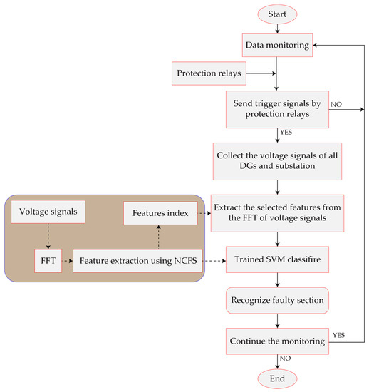 where and are weighting coefficient and classification threshold. is a kernel function that could be linear or non–linear. The flowchart of the proposed method is shown in Figure 4. According to this flowchart, a new platform for identifying faulty sections is presented using simulation data of a fault. The training process is performed in a way that this platform could identify the faulty section with higher accuracy, which results in a centralized intelligence. After a fault occurs in the network, the protection relay sends a command of fault to the pre-trained platform. The platform collects the data of all micro-PMUs in the network for the faulty spot identification process. Therefore, a communication network is necessary to gather the recorded data of micro-PMUs. In this method, there is no need for communication between micro-PMUs. The distribution networks usually have a low distance between their sections, which results in a low distance between DGs and the monitoring center. Therefore, it is possible to send the recorded data to the monitoring center for more analysis through an Internet of Things (IoT) platform. In order to execute the fault location algorithm, the recorded data must be sent to the monitoring center by means of sensors and wireless modules in the IoT platform. The estimated time to send information depends on the type of communication equipment that is used in the network. However, the execution time of the fault location algorithm is less than 100 milliseconds. Several factors must be considered in order for the proposed method to be used in real-world networks. The first is that special devices, such as micro-PMUs, are required to record the voltage of several pre-determined nodes in the network (nodes with resources). The second step is to communicate the captured data to the monitoring center through wireless modules. The third object is a communication link that is sufficiently secure against potential cyber-attacks. Furthermore, for simulation and data generation, the whole topology of the network, including all alternative topologies, must be provided. In summary, to practically apply this strategy in a real-world distribution network, metering devices, wireless data transmission modules, and IoT-based resistance (against cyber-attacks) communication platforms are required. The proposed method can only detect the faulty section and cannot predict it. As a result, if a fault occurs in a section of a smart distribution network equipped with DGs, the network might still deliver power to all consumers by removing the faulty section from the network using automated breakers on both sides of that section. The entire operation, from detecting the faulty section to isolating it, could be automated. The only difficulty would be locating the faulty section, which the suggested fault location approach would address. Algorithm 1 shows both the offline training process and the real-time fault location process. In this paper, a linear kernel is used for simplicity and computational burden. In the next part, the results are presented and discussed.