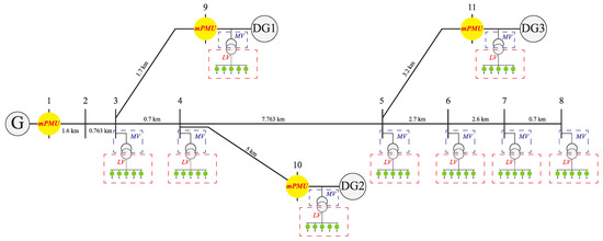 Transient and hazardous situations can arise in distribution networks due to various types of uncertainties such as loading circumstances, distributed generations (DGs) performances, and defective scenarios [1]. Some may be identified and repaired easily, while others, such as line faults, can be caused by an external object or equipment failure. Faults in distribution network lines are unavoidable, and they cannot be prevented easily [2]. Furthermore, the inaccurate identification of a fault point may delay the network’s recovery time, leading to greater financial losses and customer discontent [3]. Therefore, in order to improve network dependability, faulty areas must be diagnosed quickly and accurately. With the advancement of technology, PMUs can be utilized in electricity networks to enable automatic fault location [4]. A micro-PMU is a type of PMU that is designed to record the quantities of the medium voltage side of a distribution network [5]. Micro-PMUs can record the voltage and current of the nodes and branches of the network synchronously. These recorded data can be used for monitoring, control, design, and diagnostic purposes so that operators can comprehend the state of the distribution network in real time [6]. Using these devices in the distribution networks makes automatic data-driven fault location possible. There has been a wide range of approaches for locating distribution network faults. Impedance-based [7], traveling wave-based [8], and intelligent approaches [9] are among the most widely deployed fault location methods. A comprehensive review of different types of fault location methods and their own sets of advantages and disadvantages are reported in [10]. However, in the following, a brief review of several related works is given.