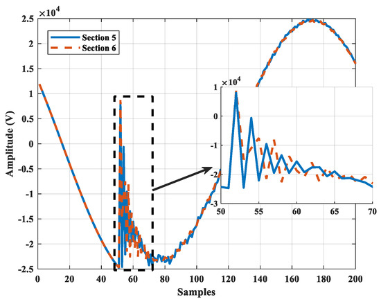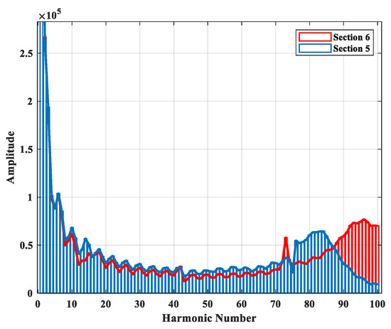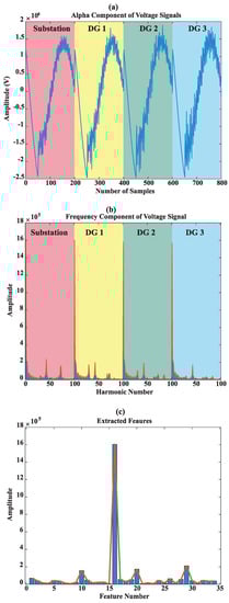 Figure 6 and Figure 7 depict the alpha component and frequency spectrum of two single-phase-to-ground faults in Sections 5 and 6. As can be seen the same fault in the different sections have different higher-order harmonics. Note that only sub-station voltage is pictured. All scenarios of fault are given in Table 2, including a total of 990 for each case of fault type. For single-phase-to-ground fault of 1-ohm resistance, the voltage waveforms of the sub-station and all DGs are depicted in Figure 8a. The first 100 harmonics of the four voltage signals are shown in Figure 8b. The NCFS algorithm was applied to the training data set and 35 harmonics out of 400 harmonics were extracted to determine the most effective for the classification procedure. Figure 8c presents the selected harmonics with the highest efficiency.