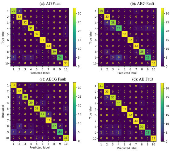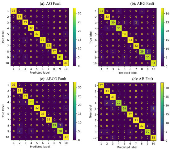 The confusion matrix for four types of fault scenarios, (a) Single-phase to ground fault, (b) Two-phase to ground fault, (c) Three-phase to ground fault, (d) Phase-to-phase fault.