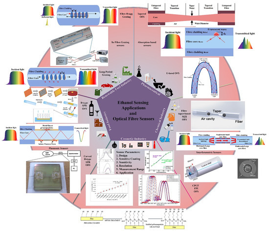Optical fibres have been investigated for their potential use in sensing applications since the early 1980s, and several advances have been made in the fields of optical fibre chemical sensing and biosensing [32]. At that time, researchers also started exploring the concept of optical fibre-based ethanol sensors [33,34]. Wolfbies et al. (1988) used enzymatic oxidation of ethanol to create an optical fibre ethanol biosensor [34]. The sensor layer included an oxygen-sensitive fluorescing indicator that detected a drop in local oxygen partial pressure due to enzymatic oxidation. The sensor detected ethanol concentrations in the range of 50 to 500 mmol L−1, with an accuracy of ±4 mmol L−1 at 100 mmol L−1. Since then, a diverse range of mechanisms have been investigated for measuring ethanol concentration using optical fibre sensors and, in some cases, real applications have been further explored using these sensing schemes. In general, these sensors have delivered encouraging results and demonstrated great potential for ethanol sensing in a wide range of applications. Figure 1 is a graphical summary of a selection of applications for ethanol sensing and optical fibre sensing schemes utilised for ethanol sensing extracted from recent literature [35,36,37,38,39,40,41,42,43] and includes sensor design parameters and typical output responses. Several articles have recently outlined and reflected on the advancement of optical fibre chemical and biosensors from various perspectives [31,32,44,45,46,47,48]. There are abundant possibilities and potential for fabricating highly effective optical fibre ethanol sensors in view of the rapid development of this technology and related functional materials [31]. This article focuses on a review of recent optical fibre sensing developments for ethanol measurement in aqueous solutions, including a perspective on their design and response characteristics. A comparison of their respective performance is provided, which points to their applicability for use in current and future full-scale industrial measurement systems. The continuously developing needs of real time measurement and the emergence of the internet of things (IoT) sets the background to this article, which is intended to inspire and focus further research and wider utilization of these sensors in the commercially significant industrial and medical sectors.
