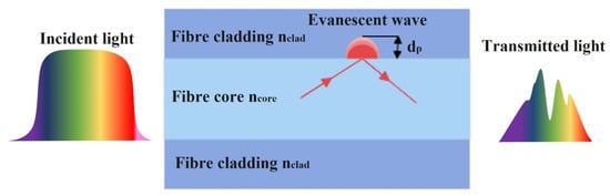 Schematic diagram of evanescent wave principle in absorbance-based optical fibre sensors.