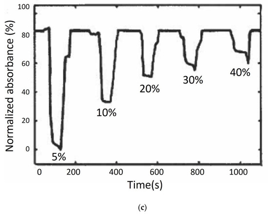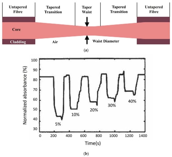 Girei et al. used a tapered silica multimode optical fibre sensor design (the generic form of which is shown in Figure 3a) to measure ethanol concentration in water. The sensor had a taper length of 20 mm and a waist diameter of 40 μm [35] and responded linearly and reversibly towards aqueous ethanol in the range of 5–40%, and the typical response and recovery time were 14 s and 27 s, respectively. In a follow-on publication, the authors compared the characteristics of graphene and graphene oxide (GO) as the coating materials in the case of multimode tapered optical fibre sensors [60]. The results showed that the GO-coated tapered sensor had higher absorption magnitude changes compared to the graphene-coated tapered sensor, owing to the higher surface area in the GO film, as shown in Figure 3b,c. The GO-coated sensor exhibited higher sensitivity for ethanol concentration in the range of 5% to 40% and a faster recovery time with a similar response time as the graphene-coated sensor [60]. Gao et al. fabricated a U-bent plastic clad silica fibre which was coated with GO to enhance the sensitivity [61]. The absorption spectra and the dynamic absorption reaction of the U-bent optical fibre sensor with and without GO film were compared for aqueous ethanol with concentrations ranging from 5% to 100%. The sensor with the GO film exhibited superior resolution and sensitivity with shorter response and recovery times, which were in the range of 1–2 s. Molybdenum disulfide (MoS2) film is considered to be more easily biomodified, chemically stable and requires low synthesis temperature than graphene. Li et al. proposed a U-bent tapered multimode fibre (TU) coated with a molybdenum disulfide (MoS2) film (MoS2@TU fibre EWA sensor) [55]. A silica glass MMF of 62.5/125 μm core/cladding diameter was initially tapered over a 3 mm length with a waste diameter of 50 µm and then bent to form a U-bent structure. A comparison between bare U-bent fibre, U-bent fibre with MoS2 film and TU fibre with MoS2 film was made for the measurement of ethanol concentrations in water ranging from 0 to 100%. The MoS2@TU fibre EWA sensor exhibited a higher change in absorption, i.e., 34% and higher sensitivity, i.e., 0.34 (change in absorption ∆A%/change in concentration ∆C%) in comparison to the bare and U-bent fibre with a MoS2 film, which was stated as 0.22. This sensor was also found to be sensitive towards adenosine which the authors’ state make them an interesting candidate for bio-sensing applications.