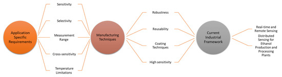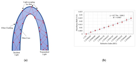 A basic optical fibre sensor system includes a light source, a sensor element and a detector. An optical fibre sensor interprets a change in the target analyte as a modulation of an optical signal and outputs the modulated optical signal for transmission to humans, computers or other devices in real time, sometimes over long distances [31]. Optical fibre sensors are generally made of glass or plastic optical fibres. A detailed description of the working principles of optical fibre sensors is widely available in the existing literature [49,50,51] and is beyond the scope of this review.