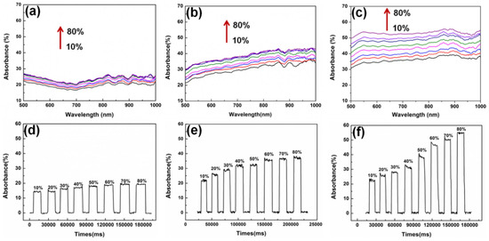 Absorbance spectra for 10% to 80% of ethanol concentration using (a) WS2@U-bent fibre for 30 s reaction time, (b) AuNPs/WS2@U-bent fibre for the 30 s reaction time and (c) AuNPs/WS2@U-bent fibre for the 60 s reaction time. The graphs (d–f) represent temporal responses at 800 nm wavelength based on the (a), (b) and (c) spectra, respectively. Reprinted from Ref. [63], copyright 2018, with permission from Elsevier.