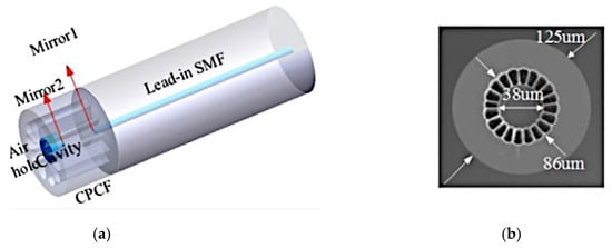 (a) Schematic structure of the concave-core PCF FPI Sensor. (b) Microscopic cross-sectional view of the CPCF. Reprinted/adapted with permission from [36]; © The Optical Society.
