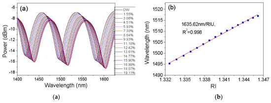 (a) Reflection spectra of CPCF PFI sensor when exposed to ethanol–water concentrations from 0 to 19.11%. (b) Relationship between the dip wavelength centred around 1500 nm versus ethanol–water solutions’ RI changes. Reprinted with permission from [36]; © The Optical Society.