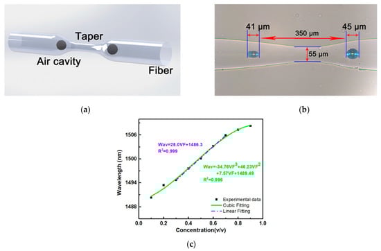 Liao al. investigated the use of an optical fibre taper-based Mach–Zehnder interferometer (MZI) configuration for ethanol concentration measurement [43]. The MZI was based on a taper and two inner air bubbles created using femtosecond laser processing as well as a combined splicing-tapering technique as shown in Figure 9a. Figure 9b is a microscope image of the structure. A non-linear relationship between the ethanol concentration and dip wavelength was observed when aqueous ethanol solutions of concentrations ranging from 10% to 90% were tested. A linear response was observed in the 30% to 70% ethanol–water concentration range, as shown in Figure 9c, with a sensitivity of 28 nm/vol or 592.8 nm/RIU. Recently, Zhou et al. proposed a Michelson Interferometer optical fibre probe for RI measurement, where the main highlight was the capability of temperature compensation of liquids during the RI measurement [69]. Zhou et al. developed a cavity using femtosecond laser machining located very close to the end of a cleaved fibre tip. The fibre tip was cleaved at a 45° angle with respect to the fibre axis. When this sensor was exposed to air it created a Fabry–Perot cavity and behaved as a Michelson interferometer when exposed to liquid. This sensor was not directly interrogated for ethanol as the liquid of interest. However, it was characterised in terms of the RI range for which experimental data matches with typical ethanol RI values. The temperature dependence for ethanol, methanol and water were measured at an interrogating wavelength of 1550 nm, where the measured results agreed well with experimental data from other researchers. However, there was a considerable change in the thermo-optic coefficient of methanol with a theoretical estimate. This sensor exhibited a sensitivity varying from 885.437 to 1067.525 nm/RIU when the RI varied from 1.3166 to 1.4346.
