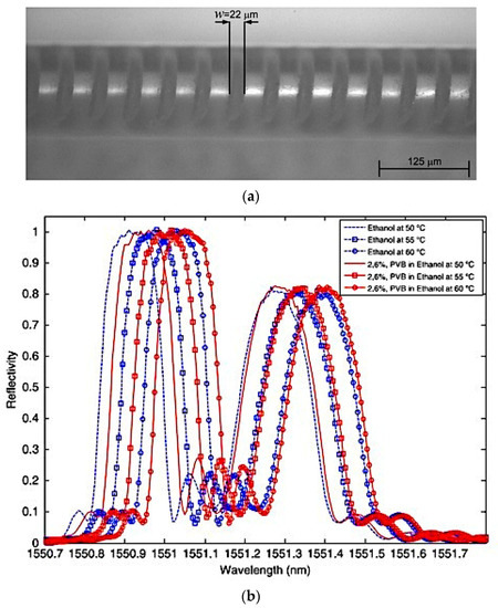 Alemohammad et al. proposed a femtosecond (FS) laser micromachining fabrication process to inscribe micro-grooves in the cladding of the optical fibre, thereby incorporating FBGs for effective coupling of the propagating core modes to the surrounding medium [42]. A microscope image showing the on-fibre fabricated structures is shown in Figure 11a. The prepared FBG sensors were immersed in solutions of 2.6% and 4.8% polyvinyl butyral (PVB) in ethanol for concentration measurement along with their thermal responses, for which reflection spectra are shown in Figure 11b. The findings demonstrated enhanced sensitivity to the concentration of the surrounding medium and these micromachined surface-modified FBG sensors may be used for simultaneous concentration and temperature sensing in chemical and biological liquids.