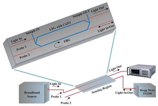 Cuprous oxide-coated LPG- and FBG-based optical fibre sensing setup with a PMMA-based flow cell for sample inflow and outflow. Adapted from Ref. [37].