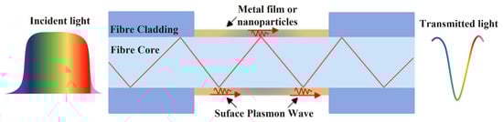 The fibre surface plasmon may be divided into two categories based on the plasmon mode of transmission: SPR and localised surface plasmon resonance (LSPR). SPR is created by coating a thin metal film on the surface of an optical fibre and the resonance condition that occurs at a specific wavelength generates SPR, leading to a dip/attenuation in the spectrum at the resonance wavelength. LSPR is created by coating metal nanoparticles on the fibre and when the incoming light frequency resonates with the entire vibrational frequency of the conducting electrons in the metal nanoparticles. The light energy is significantly absorbed at this frequency (wavelength) [87]. SPR and LSPR resonant wavelengths change when the surrounding RI of the metal layer changes.