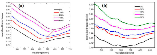 Transmission spectra of D-type fibre SPR sensor for different alcohol concentrations: (a) Au-graphene film-based, (b) gold film only. Reproduced from Ref. [39].