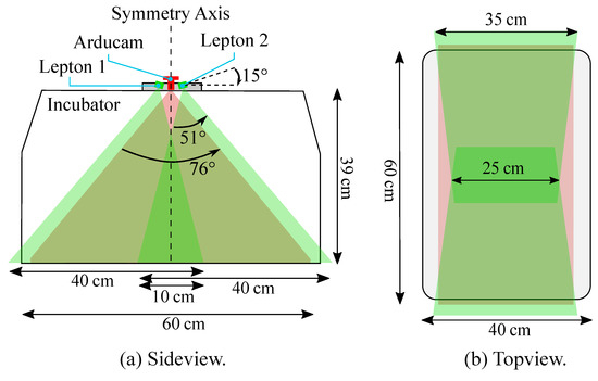 The Lepton cameras were tilted by against the horizontal line, and with their wider viewing angle parallel to the longer axis of the incubator, in order to capture as much of the mattress area as possible. With this arrangement and the usage of two Leptons, the whole scene could be captured, apart from some small cutouts in the overlapping area (cf. Figure 3b). The Arducam was centered in between the Leptons and had a large HFOV, providing an overview of the whole mattress.